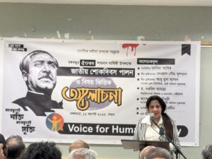 বঙ্গবন্ধুর ৫০তম শাহাদাত বার্ষিকীতে ‘ভয়েস ফর হিউম্যান ডিগনিটি‘ নামের একটি মানবিক সংগঠন আয়োজিত জাতীয় শোক দিবস, বাংলাদেশের বর্তমান রাজনৈতিক সংকট ও বঙ্গবন্ধুর রাজনীতির প্রাসঙ্গিকতা নিয়ে আয়োজিত সেমিনারে বিষয় ভিত্তিক আলোচনায় আলোচকবৃন্দ এসব কথা বলেন।