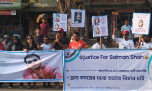 ‘জাস্টিস ফর সালমান শাহ’ স্লোগানে সজ্জিত ব্যানার নিয়ে নানা রঙের ব্যানার, প্ল্যাকার্ড ও ফেস্টুনে সাজানো এই মানববন্ধনে অংশ নেন সারা দেশ থেকে আসা সালমান ভক্তরা। তারা হত্যা মামলার সুষ্ঠু তদন্ত এবং দ্রুত সব আসামিকে গ্রেপ্তার করে ফাঁসির দাবি জানিয়েছেন।
