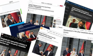 ‘নির্বাচনে তার দলের নিরঙ্কুশ জয়ের পর শপথ গ্রহণ করেছেন বাংলাদেশের নতুন প্রধানমন্ত্রী’, বার্তা সংস্থা অ্যাসোসিয়েটেড প্রেস (এপি) তাদের প্রতিবেদনের শিরোনাম করেছে এটি।